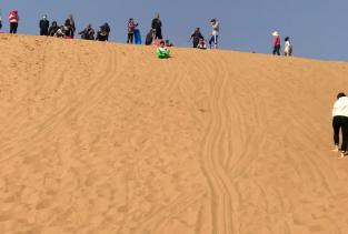 沙坡头景区门票四口人240元,摆渡车120元,单程索道100元,先去的黄沙区,那天正好阴天,有点凉,还好,要是晴天的话估计沙子会烫脚,孩子们玩的很开心,之后乘摆渡车去的黄河区,玩了玻璃桥,索道车,很开心~